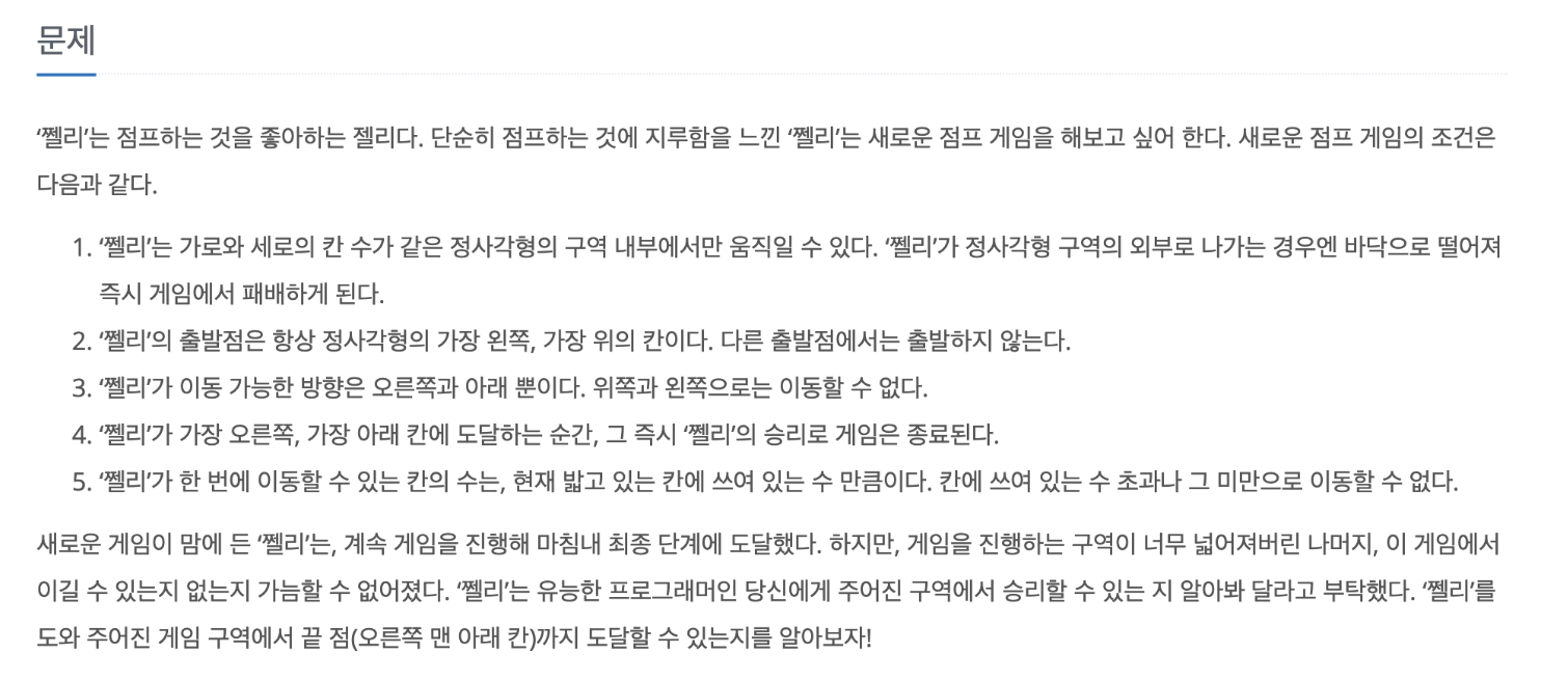 그럼 이차원배열을 사용해서 한 번에 이동할 수 있는 칸의수를 맨 오른쪽 아래 칸에 도달할 수 있는지 없는지를 판단하면 되지 않을까? 라는 생각이 들었다.