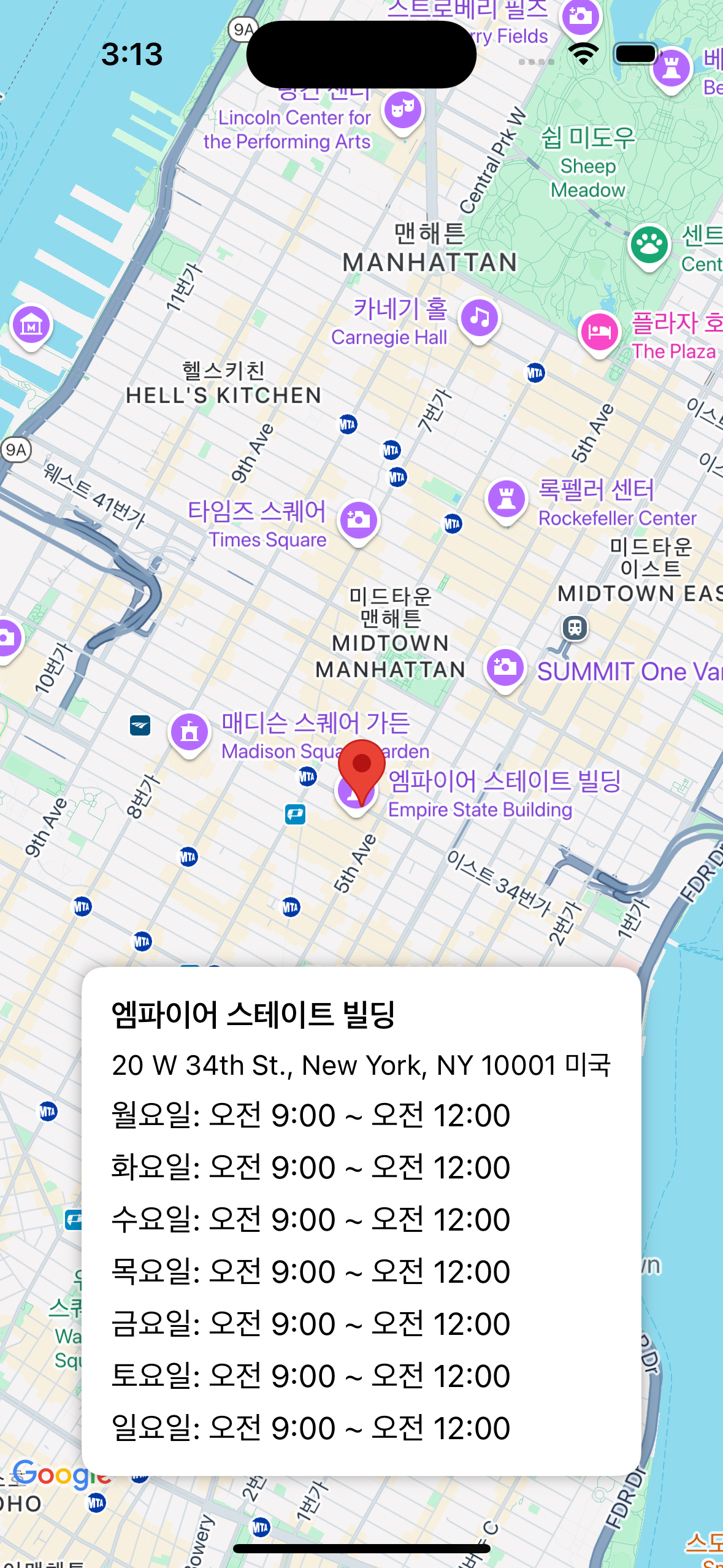 이번에는 엠파이어 스테이트 빌딩을 마커로 찍고 운영시간을 띄워주고자 위도와 경도를 수정해 주었다!