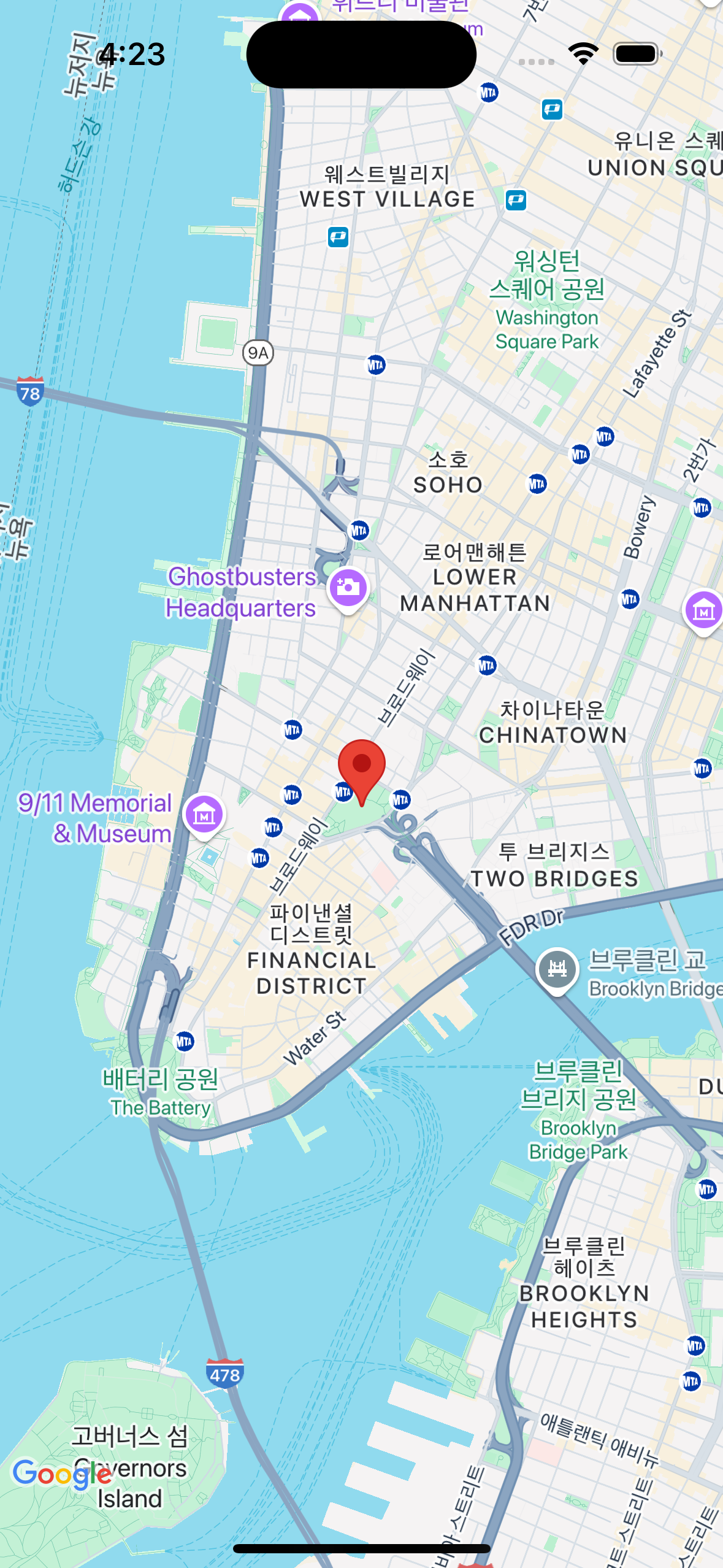 나는 뉴욕 기반 지도만 불러오면 되기 때문에 뉴욕 맨해튼 어딘가로 경도와 위도를 찍고 나타내줬다.