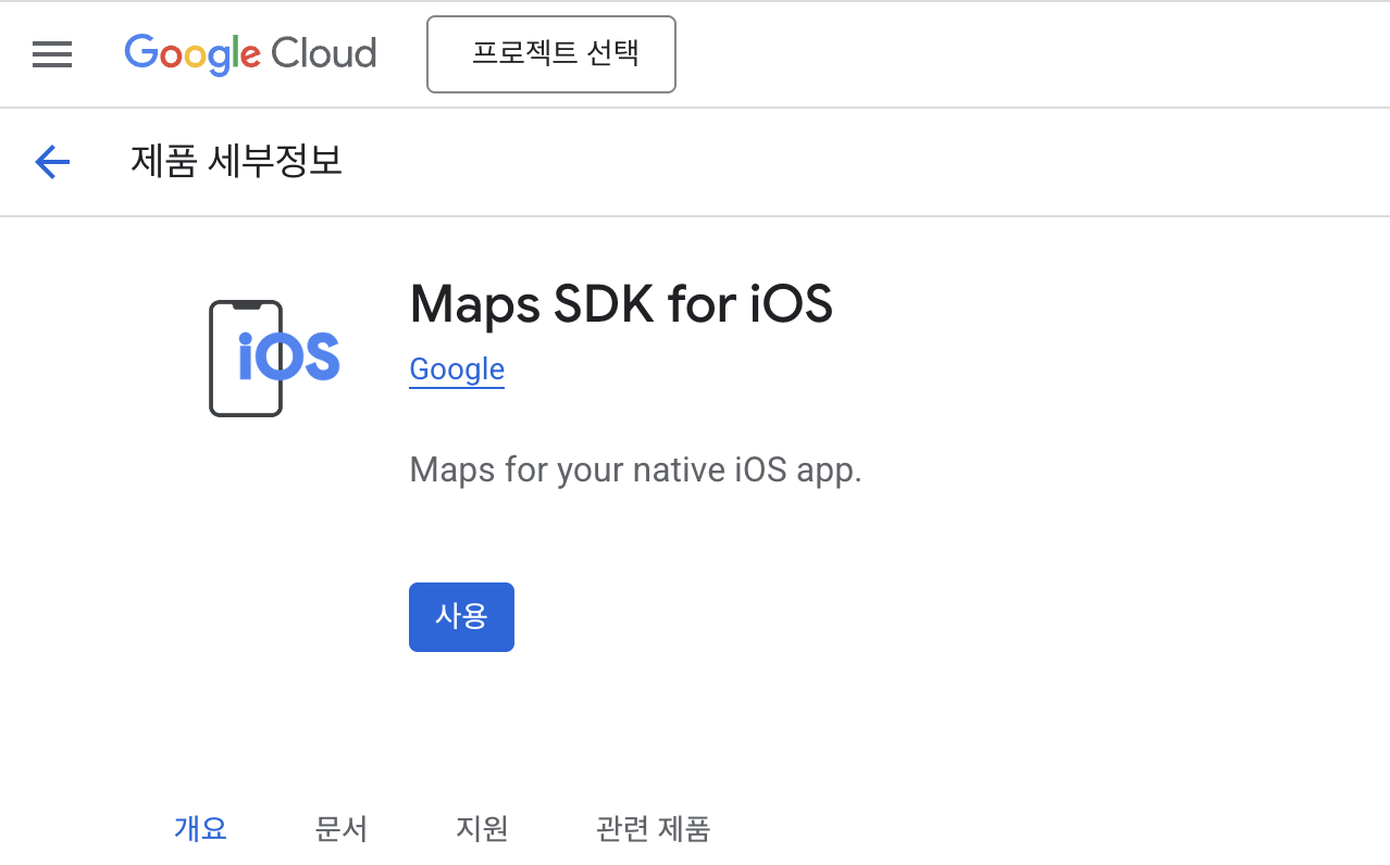 위 링크를 통해서 Maps SDK for iOS를 검색하면 쉽게 사용할 수 있는 게 있다. 여기서 사용 눌러주면 다음 정보로 넘어간다.
